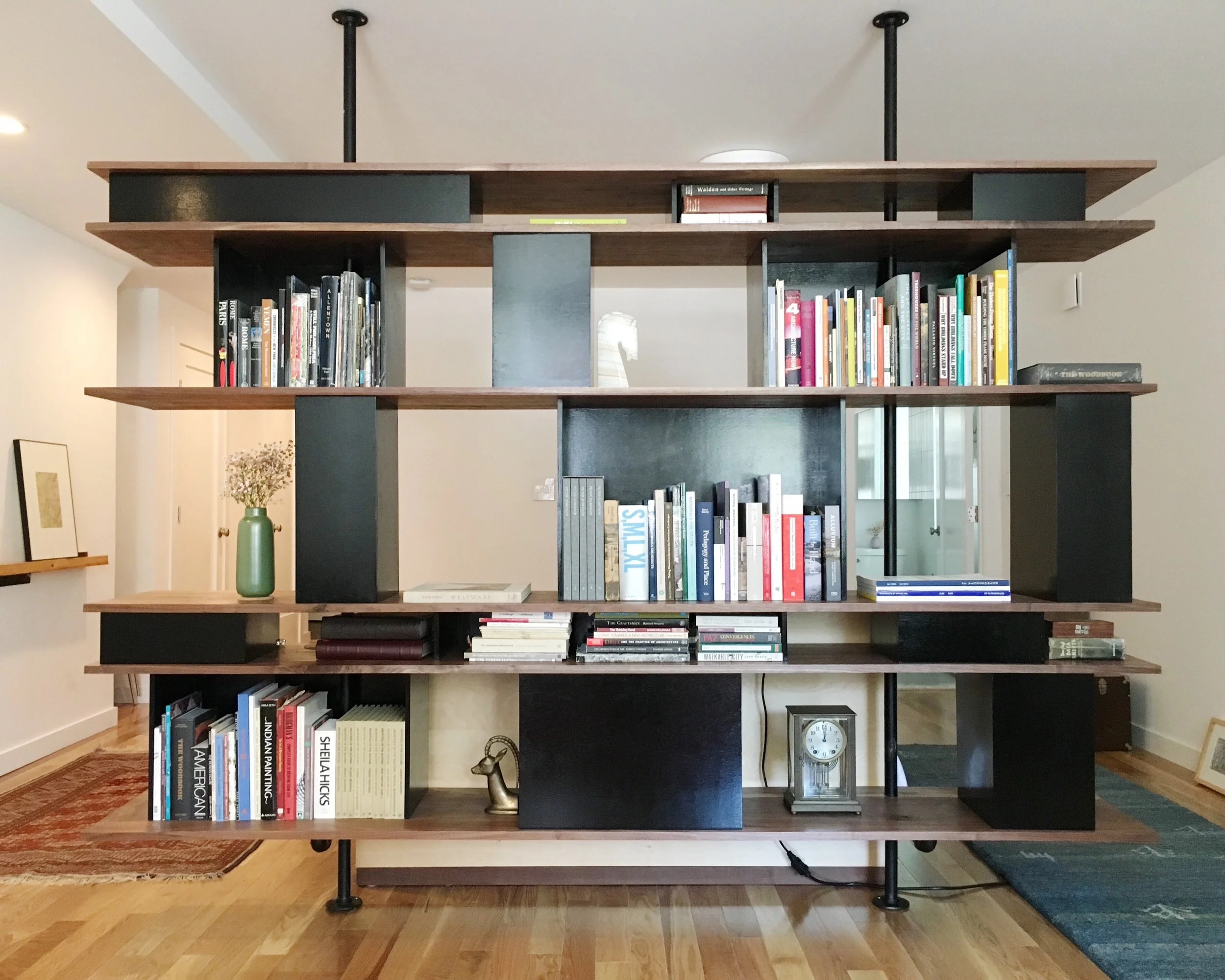 Room Divider & Book Shelving System, Black Walnut with Painted Plywood and Metal Pipe, New York, 2017